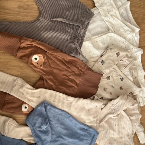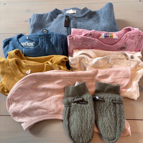 Det står 70 og 80 på noen av plaggene, men tilsvarer 74 og 86, så litt store i størrelsen, men enkelt å brette opp og bruke lenge. Vi har brukt det lite, da tvillingene ikke tåler ull!