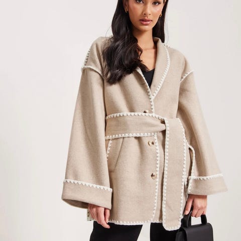 Jakken er grå med kontrastsømmer langs kanter og ermer. Den er laget i polyester og har rett passform med knappelukking foran. Modellen har lommer i sidene og leveres med matchende skjerf med frynser i samme materiale og farge. Egner seg som ytterjakke i overgangssesonger. Lite brukt