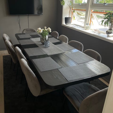 Det er plass til tre spisestoler på hver side, eller to for et mer luftig uttrykk. Følger også med to tilleggsplater i hvitpigmentert oljet massiv eik som kan festes på hver siden. Hver plate er på 50cm. Bordet kan da bli 280cm.