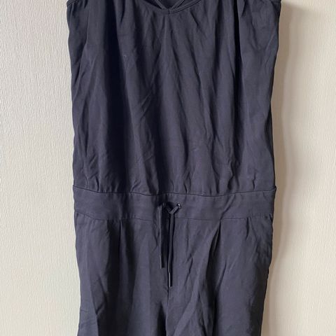 H&M blå jumpsuit for dame i størrelse 38. Plagget er laget i polyester. Jumpsuiten har brede skulderstropper som ser knyttet ut på skuldrene og V-utringning foran.