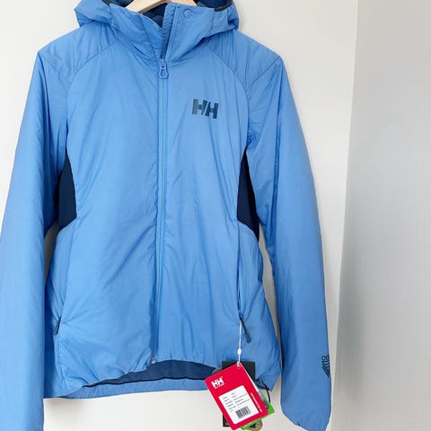 Helly Hansen sportsjakke for herre i størrelse L. Jakken er i lett materiale egnet for løping , ski og annen trening. Den har krage, gjennomgående glidelås i front og glidelåslommer i sidene. Fargen er oransje med Helly Hansen-logo på brystet. Passer til bruk på løpeturer og annen utendørs aktivitet.