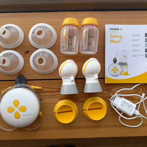 Medela Swing Maxi elektrisk brystpumpe med motorenhet, strømadapter, slanger og brystskjold/oppsamlingsskåler. Pumpen har betjeningsknapper på enheten for regulering av styrke og rytme. Settet inkluderer flere oppsamlingsdeler i plast som plasseres mot brystet for å samle opp morsmelk. Egnet for pumping av morsmelk hjemme eller på farten. Plastdeler kan tas fra hverandre for rengjøring i henhold til produsentens anvisninger.