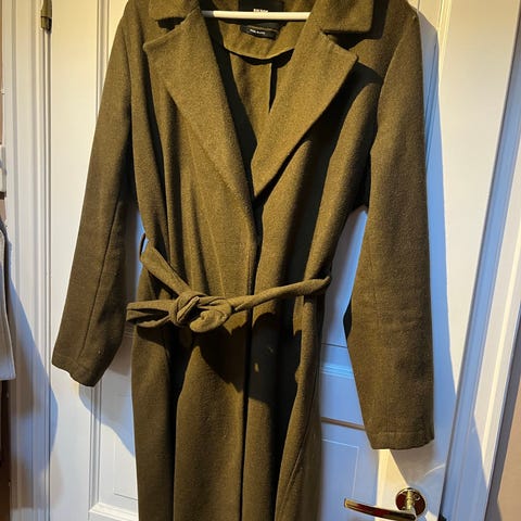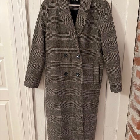 Jeg bruker medium til vanlig, men denne er oversized og xs passet meg fint. Når meg på 168 cm under knærne. Veldig pent brukt, men noen nupper. Ullblanding: 82% polyester, 18% ull.