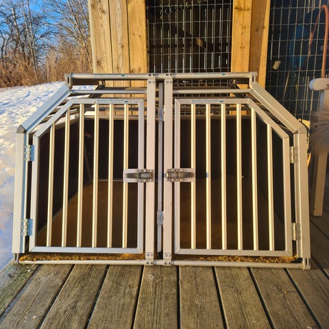 Dobbelt hundebur i metall med trebunn. Buret har to separate rom med egen dør til hvert rom. Rammekonstruksjonen er laget av metallgitter, mens gulv og skillevegg er av treplater. Dørene har metallåser for sikker lukking. Egnet for transport eller oppstalling av to hunder i hver sin avdeling. Mål fremgår delvis av bildene med målebånd; selger kan kontaktes for eksakte ytre mål.