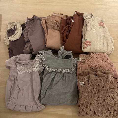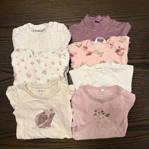 Newbie barneklær for jente i størrelse 98/104 i flerfargede blomstrete mønstre. Plaggene består av ulike overdeler og to pyjamaser i myke materialer egnet til hverdagsbruk. Plaggene er pent brukte og noen kun brukt et par ganger.