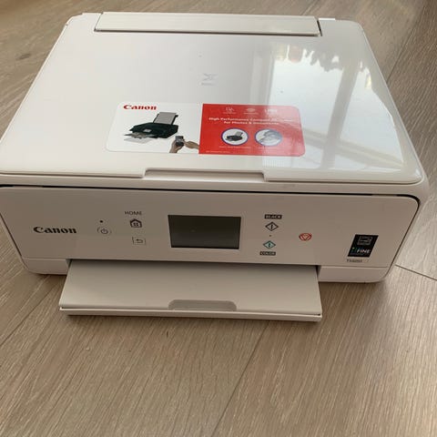 Canon PIXMA multifunksjonsskriver i svart farge. Enheten kombinerer skriver, skanner og kopimaskin i én enhet. Toppmatede dokumenter legges på skannerlokket, og betjeningspanel med display og knapper sitter på venstre side. Skriveren er egnet til utskrift og kopiering av dokumenter og bilder i hjem eller på kontor, samt skanning av dokumenter til videre behandling eller lagring digitalt.
