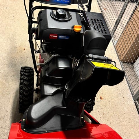 Til info: Denne har "spist" litt grus i sitt tidligere liv, så har jevnet ut utkasterhuset med metallsparkel og lakkert det opp med original Toro spraylakk. Har samtidig lakkert opp utkasterviften og montert impellerkit for enda bedre kasteevne.