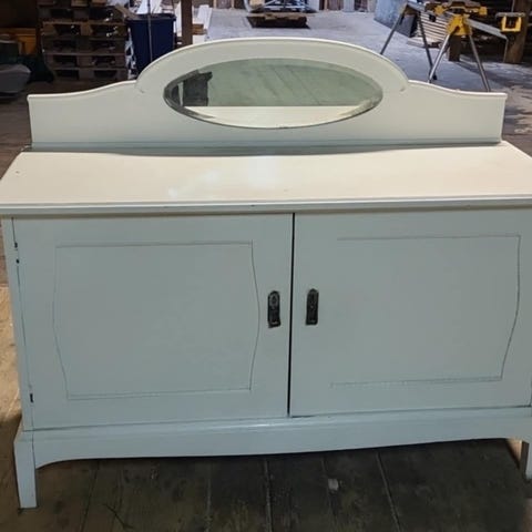 Et vakkert smykke av en skjenk selges med tungt hjerte på grunn av plassmangel. Skapdørene er litt trege, og ellers er det bruksmerker som naturligvis følger med et sånt flott og gammelt møbel.