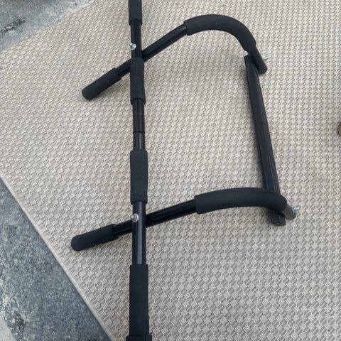Pure 2Improve training tube doorway. Turn a door frame with a training tube into a training ground. Use the P2I tube by attaching it to a high door frame to perform jaw lifts and stretching exercises, or low to train the abdominal muscles. Material: steel and foam. Mini-max door opening 63-96cm. Maximum weight 120kg. Black steel, black red striped foam handles. No tools are required to install the pipe, the lever is pushed firmly between the door frames by turning