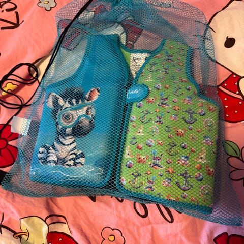 Kiokids svømmevest for barn i størrelse S. Vesten er beregnet for barn med vekt 11-15kg. Den har blå og oransje farger med dyremotiv på utsiden. Innvendig er det flyteelementer som kan tas ut etter behov. Vesten har glidelås foran og stropp mellom bena for bedre passform. Egnet som svømmehjelp for barn som øver på å svømme under tilsyn av voksen. Obs ikke redningsvest
