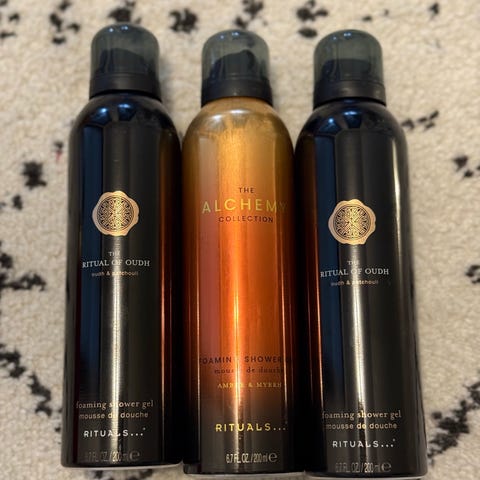 Rituals skummende dusjgelé i tre varianter. To flasker inneholder 200 ml og én flaske inneholder 250 ml.