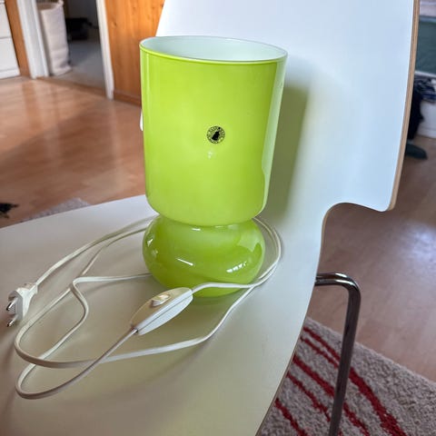Vakker hvit retro Ikea Lykta bordlampe. Lampen er laget helt i glass. Vintage modell med original elektrisitet, gjennomgått og revidert. E14-sokkel. Diameter 12 cm, høyde 25 cm.