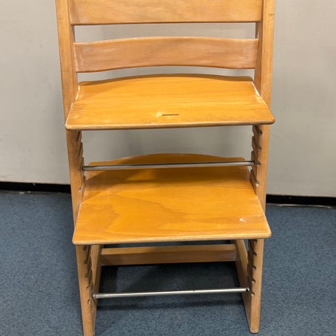 Stokke Tripp Trapp høy barnestol i naturfarget tre (bøk). Stolen har justerbar sitteplate og fotbrett som kan tilpasses barnets høyde. Klassisk design med sidestykker som har spor for enkel regulering av platene. Egnet som barnestol ved spisebord eller arbeidsbord, og kan brukes over flere år etter hvert som barnet vokser.