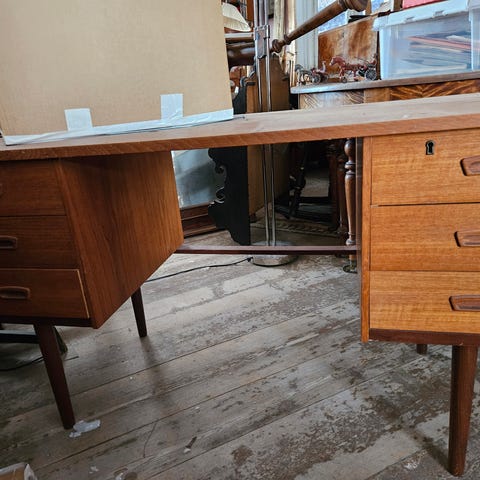 Ganske strøkent Teak skrivebord. Klassisk skandinavisk design med 6 skuffer, midtskuffe og bokhylle langs hele baksiden, Minimal bruksslitasje. Passer til hjemmekontor og retrointeriør.