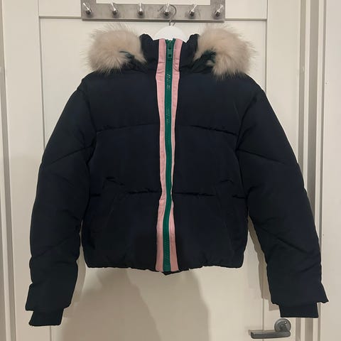 Replay overgangsjakke for dame med avtagbar hette med mørk blå fuskepelskant.