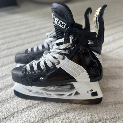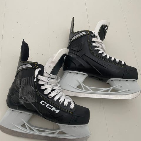CCM ishockeyskøyter i størrelse 43 (US 8,5). Skøytene har tradisjonell snøring og er merket som regular bredde. Overdel i syntetisk materiale med polstret innside for støtte rundt ankel og fot. Passer til ishockeybruk på isbane eller ishall.