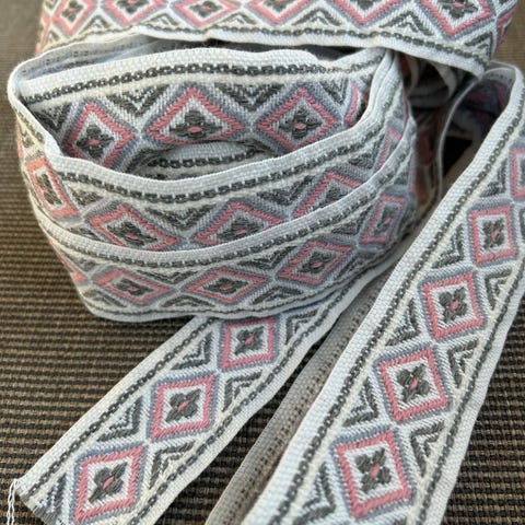 Dekorbånd i tekstil med vevd, flerfarget mønster i blå, turkis, sølv og burgunder nyanser. Båndet har dekorative detaljer, blant annet små paljetter, og egner seg til søm, hobbyprosjekter, kanting av plagg, interiørdetaljer eller annen dekor. Kan brukes til for eksempel vesker, puter, kostymer eller andre kreative prosjekter der man ønsker et markert og mønstret bånd.