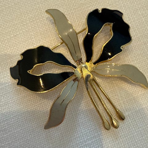 Brosjen har blomsterform med stor perleimitasjon i midten og klare steiner rundt. Metall i gullfarge med nål og lås på baksiden. Passer til bruk på jakker, gensere eller skjerf.