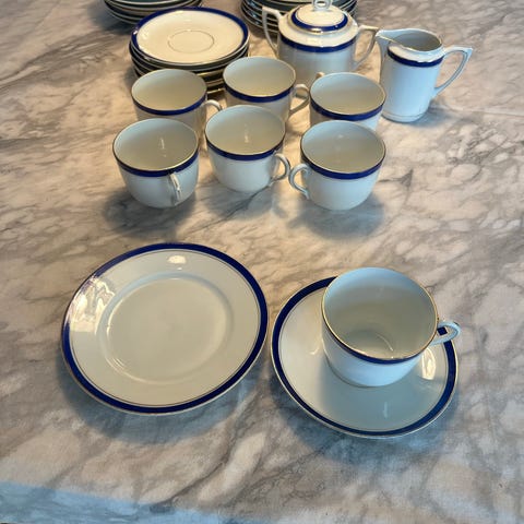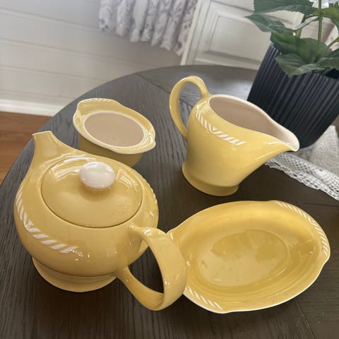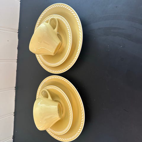 Servise kaffesett i gult porselen. Settet består av flere kopper med tilhørende asjetter og tallerkener i samme farge. Dekoren har en lys, tvunnet kantbord rundt kanten på tallerkener og asjetter. Kopper og skåler har samme gulfarge uten dekor. Egner seg til servering av kaffe, te eller andre varme drikker, samt kaker og småretter. På nærbilde vises en liten skade på kanten av en kopp. Tror Desse koppene og er sisselHer er kunnen kopp lite hakk i ellers så skal alt vere uten krakelering i selges alt samla 1800+porto 4deler ekstra følger med.2tefatt og 2 tallerken.Kan vere ett par av tallerkenene er lite krakelert på Derfor får du det på kjøpet