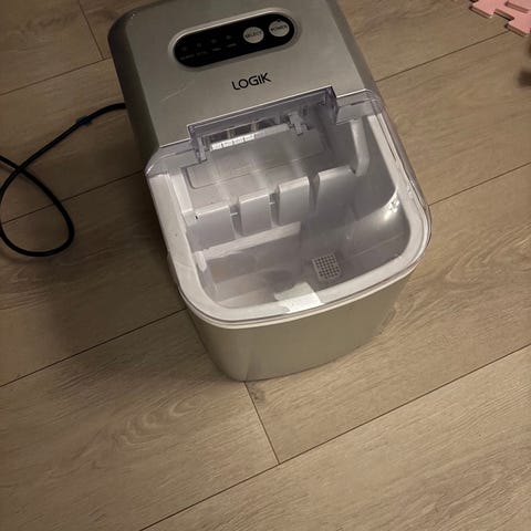 Logik isbitmaskin i bordmodell i sølvfarge. Enheten har gjennomsiktig lokk som gjør det mulig å følge med på isproduksjonen, samt uttakbar iskurv med dreneringshull. Kontrollpanelet på toppen har tydelige knapper og indikatorlamper for drift og vann-/isnivå. Isbitmaskinen kobles til vanlig stikkontakt og er egnet til bruk på kjøkkenbenk eller andre flate overflater i hjemmet, på hytta eller i mindre kontormiljøer.