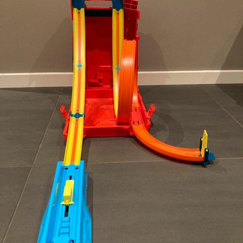 Hot Wheels bilbane i plast i flere farger. Banen består av rette og buede deler med høyde og nedoverbakke, samt startseksjon med to spor. Passer til små lekebiler fra Hot Wheels og lignende størrelser.