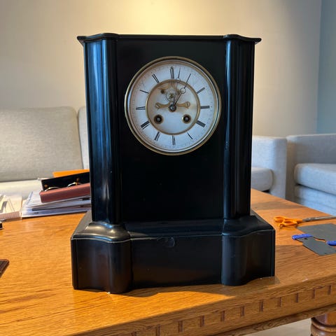 Bordklokke i brun utførelse med integrert hundefigur på siden. Klokken har rund urskive med tydelige arabiske tall og to visere. Urskiven er innrammet i en lys metallring. Huset er formet som en dekorativ skulptur, trolig i keramisk eller lignende materiale, med blank overflate. Baksiden har åpning til urverk. Egner seg som dekorativ bordklokke i stue, gang eller på hylle.