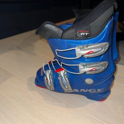 LANGEalpinstøvler i blå plast med fire spenner foran. Innerstøvel i tekstil/skum med høy skaft for støtte rundt ankel og legg.
