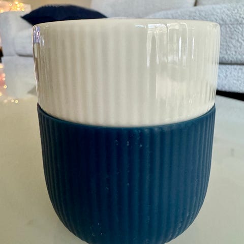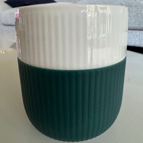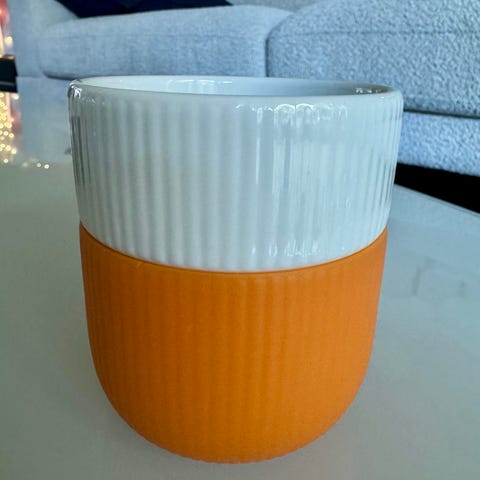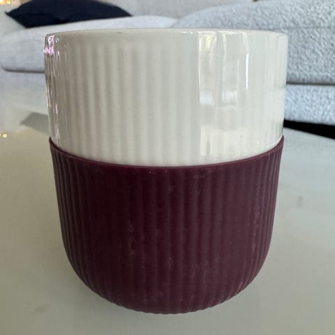 Royal Copenhagen kopp og krus i porselen. Begge deler har rillet struktur og tofarget design i rød og hvit glasur.
