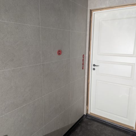 Dette er plater som er restmateriale. Panelene leveres som plater beregnet for montering på vegg, for eksempel i rom som bad, vaskerom eller andre innvendige rom der det ønskes en slett og vaskbar overflate. Bildene viser et parti med plater på pall, samt tilhørende Fibo-produkter som monteringsutstyr og rengjøringsmidler. Det følger også med QR-kode til monteringsvideoer på norsk og engelsk på emballasjen. Presise mål, tykkelse og antall plater er ikke oppgitt og bør avklares ved interesse.