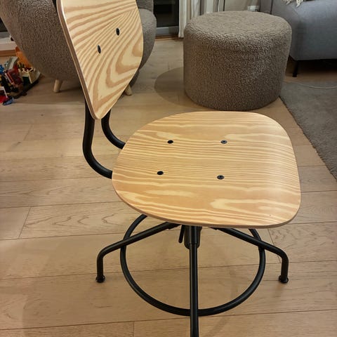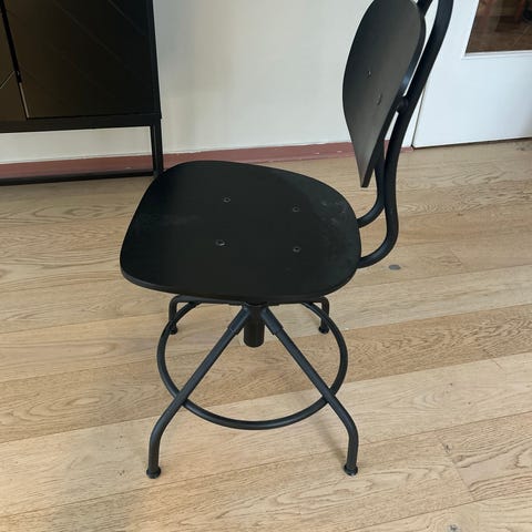 Fire stoler som stod i leiligheten min da jeg overtok den. De er i tre og metall, og har sine sjarmerende skavanker og slitasjer. Ser ut som gamle skolestoler kanskje?