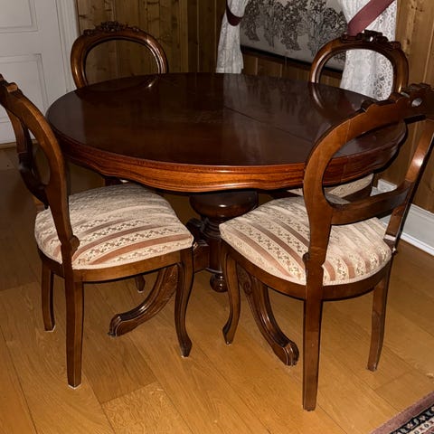 Har også 6 stoler som passer til bordet. Disse har ben i tre og sete/rygg i mikrofiber. Stoltrekkene har noe synlig slitasje/frynser som følge av kjærtegn fra katt, men er generelt i god stand.