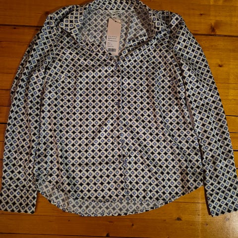 Fin og ny-ubrukt skjorte, Småmønstret over hvit bunn i bomull. Lyseblått for på krage og mansjetter.