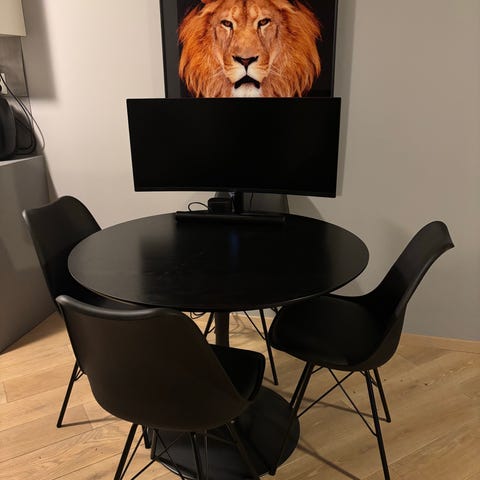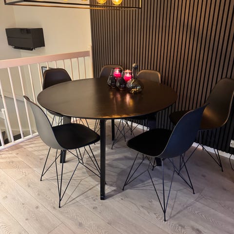 Rundt spisebord med fire tilhørende stoler i svart. Bordet har rund bordplate og moderne understell i metall. Stolenes sete og rygg er polstret og trukket i mørkt stoff, med slanke ben i metall. Passer som spisegruppe på kjøkken eller i spisestue for 4 personer.