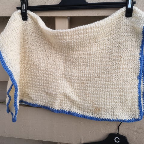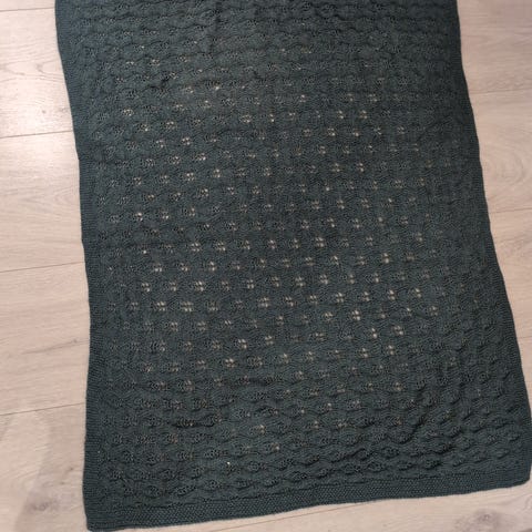 Strikket babyteppe og sokker i gul farge. Teppet har hullmønster og rette kanter rundt. Sokker i samme garn og farge som teppet. Passer til bruk i vogn, seng eller som koseteppe til baby.