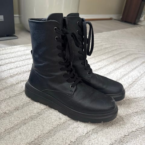 Ecco støvler i størrelse 42. Modellen heter Nouvelle, de er i svart skinn med snøring foran og glidelås på siden. Veldig myke og gode sko, god kvalitet. Veldig lite brukt, ser omtrent nye ut. Selges videre fordi de dessverre er litt smale til meg (passer ikke til brede føtter).