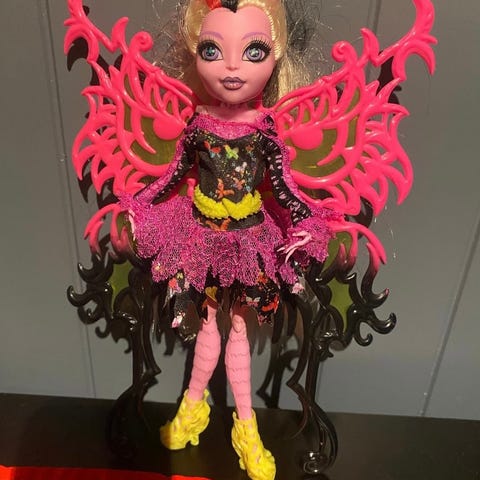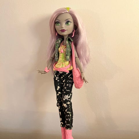 Monster High dukke med grønn hud og langt hår i rosa og lysegrønt. Dukken har bevegelige ledd i armer og bein. Den har rosa topp og mønstret shorts i rosa og svart, samt grønne armbånd og beinpynt og svarte sko med rosa detaljer. Leveres på dukkeholder som vist på bildene. Egnet som lekedukke eller samleobjekt for Monster High-serien.