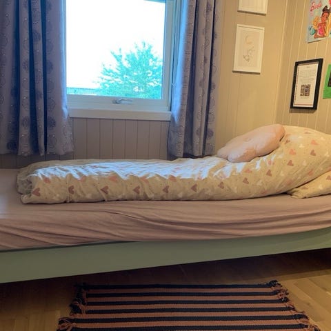 IKEA juniorseng i tre med brun finish. Todelt madrass og sengebunn i tre følger med. Kan trekkes ut til 200cm lengde. Senga har stått i hytte, og er derfor lite og ikke synlig brukt