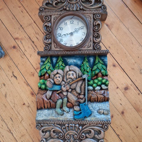 Veggklokke med trollmotiv.