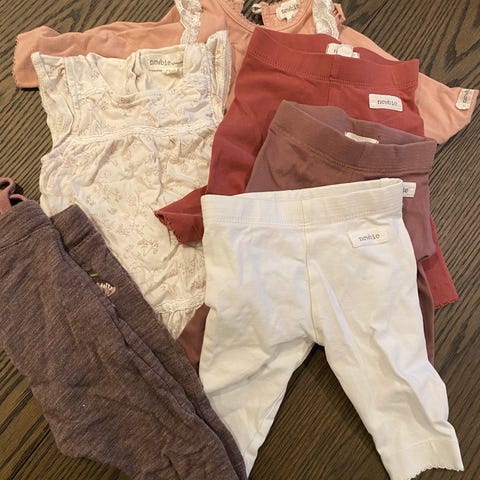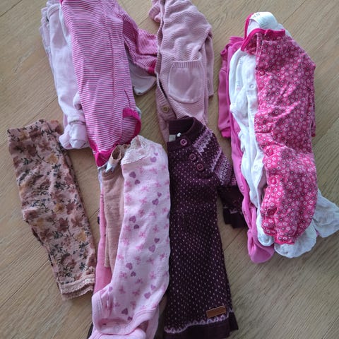 Name it, H&M, Lindex babyklær for jente i størrelse 56 -74, i flere farger. Pakken inneholder ulike typer plagg som blant annet bodyer, bukser, kjoler, jakker og heldresser, slik bildene viser. Klærne har varierte mønstre og farger, hovedsakelig i lyse og rosa toner kombinert med andre farger. Egnet til hverdagsbruk for baby i størrelse 56-74.