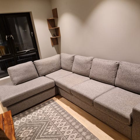 Hjørnesofa i tekstil med sitte- og ryggputer i beige og base i brun tekstil. Sofaen har en stor sjeselongdel på den ene siden og rette avslutninger på armlenen. Utformingen gir god sitteplass langs begge vegger i et hjørne. Tekstiltrekket har en nøytral fargekombinasjon som passer inn i mange typer stuer. Sofaen er egnet som hovedsofa i stue eller TV-rom.