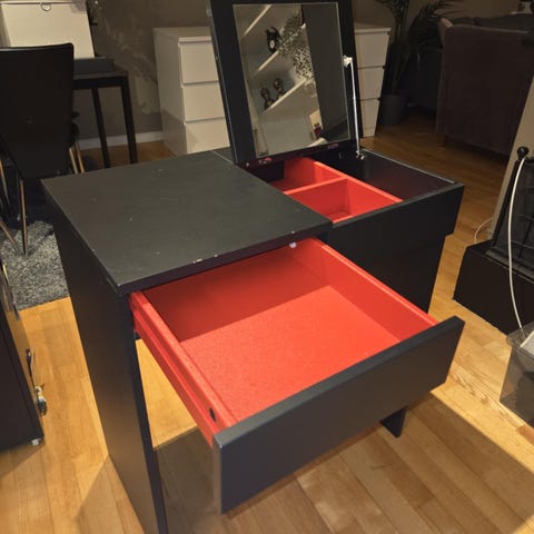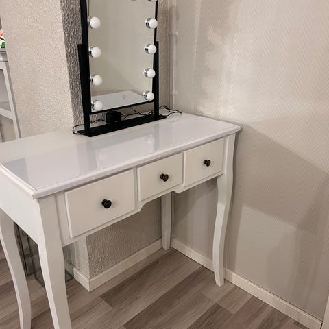 Selger sminkebord og benk fra IKEA. Selges samlet. Må hentes. Brukt men i god stand. Noen bruksmerker i glassplaten. Nypris sminkebord: 1295kr. Nypris benk: 949kr
