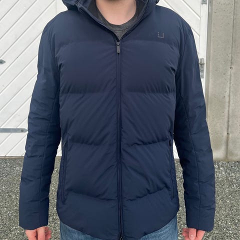 Dunjakke fra UBR med full stretch til herre. Jakken er både varm og lett. Den er også vindtett og vannavstøtende. Kommer med hette, og to sidelommer med glidelås.