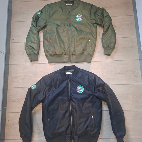 Ny og ubrukt Castrol bomberjakke, str. M - unisex. Normal/raus i størrelsen. Laget av 100% polyester, men behagelig og luftig å ha på seg. Kakigrønn