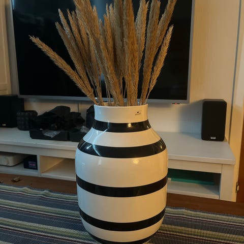 Kähler vase 20 cm i keramikk i hvit farge med horisontale sølvfargede striper. Vasen har rund form med smalere åpning øverst. Passer til bruk med snittblomster, grener eller som dekorasjonsobjekt i interiøret. Merking med Kähler-logo under bunnen.