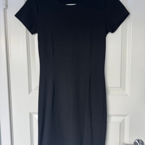 H&M hverdagskjole for dame i størrelse L. Kjolen er svart og laget av polyester. Modellen har rund hals og korte ermer, og går til under kneet avhengig av høyde. Stoffet har lett struktur som gir et enkelt og rent uttrykk. Egner seg som hverdagskjole og kan brukes både alene eller sammen med strømpebukse eller jakke.