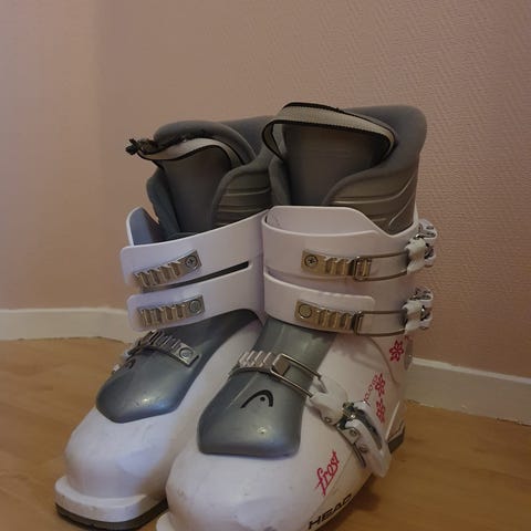 Head alpinstøvler i svart og hvit med røde spenner. Støvlene har fire justerbare spenner og polstret innersko for støtte og komfort. Sålen har mønster for bedre grep ved gange. Egnet til bruk med vanlige alpinbindinger.