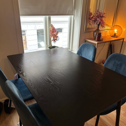 Selger et pent og moderne spisebord i fargen «valnøtt».