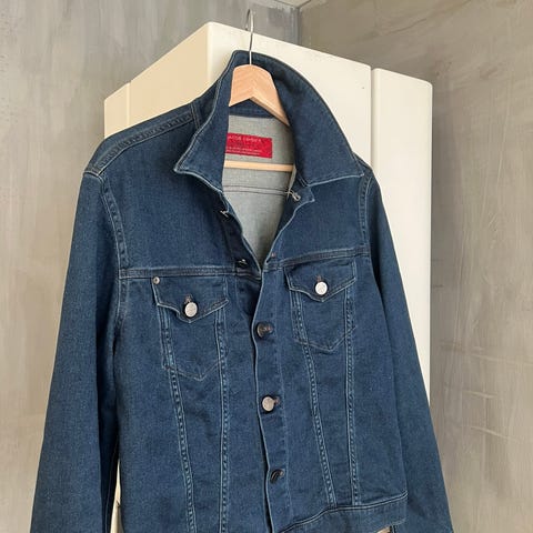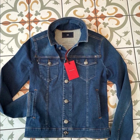 Selger en meget stilig og ubrukt denimjakke fra det italienske luksusmerket Jacob Cöhen. Jakken har en flott, "grov" tekstur og dyp blåfarge som gir et robust, men eksklusivt uttrykk.