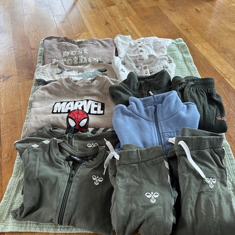 Pysjene, finbuksa og hummel-genserne er godt brukt, men hele.