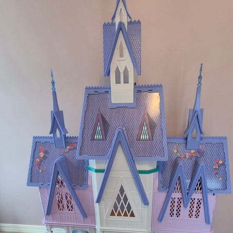 Svært pent, men virkelig velbrukt lekeslott inspirert av Frost som passer for dukker i Barbie størrelse og nedover. Det ble kjøpt til en Frost-fanatiker på 3 år som nå er 9 år og som har akseptert at hun er ferdig med det.